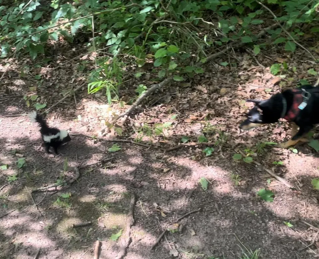 My dog Pita got sprayed by a baby skunk. He was bathed in tomato juice three times and still had a touch of the unpleasant skunk odor. I had purchased a bottle of the bug repellant earlier in the day and had it sitting by the door.